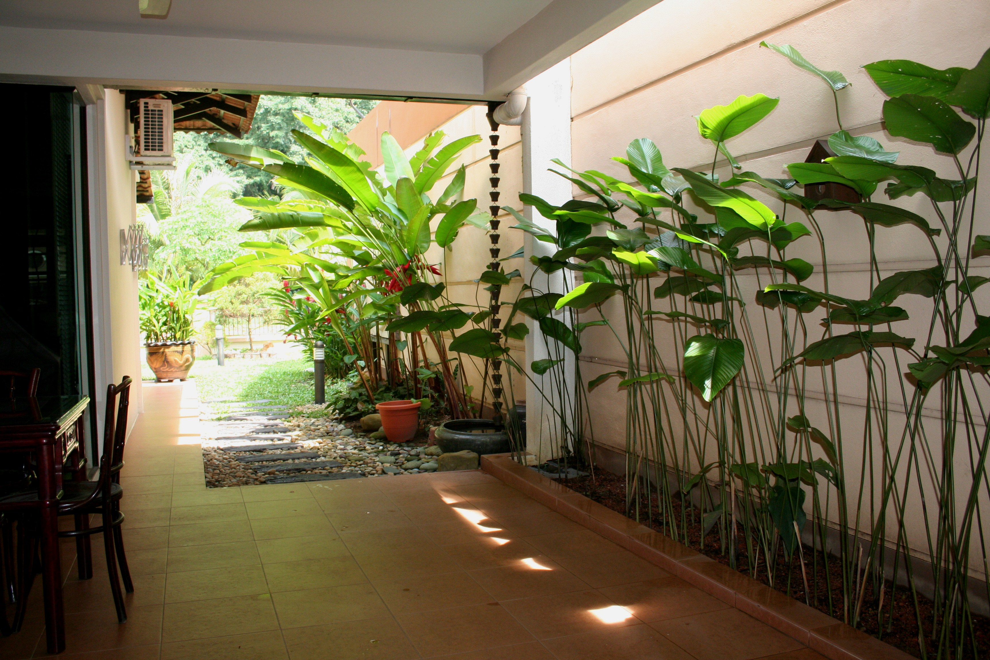 This is the courtyard at the side of our house at Lakeside Villas and we spend a lot of time out here. It is cool, catching any breeze that there is, and there is a large fan in the ceiling. There is also a small table where we often eat all three meals. However, we are driven inside when the nearby theme park (http://www.sunwaylostworldoftambun.com/) starts playing music over its very loud sound system. The bass beat reverberates off the limestone hills straight into our courtyard. We have complained in person and by letter/email and were told that Sunway (the huge property company that developed Lakeside Villas and other housing complexes in the area, and owns the Lost World of Tambun theme park) seeks to provide “wholesome, family entertainment”, which obviously involves loud, repetitive “music”. Noise seems to be part of our lives here. The beautiful grounds around the area, which are also maintained by Sunway, are kept in shape by workers using very noisy tools – the grass is cut by teams of people each wielding a screaming trimmer and there is often the drone of leaf blowers. No “soft sighing of summer lawns” here! Renovating houses, which are barely seven years old, seems to be a favourite pastime of home-owners in Lakeside Villas. Several of our neighbours have moved out and left us to endure the noise of jack hammers and tile cutters. But today all is quiet – the builders have moved out of our street and the Lost World is not playing any music. Today we’ll enjoy our lunch in the courtyard.